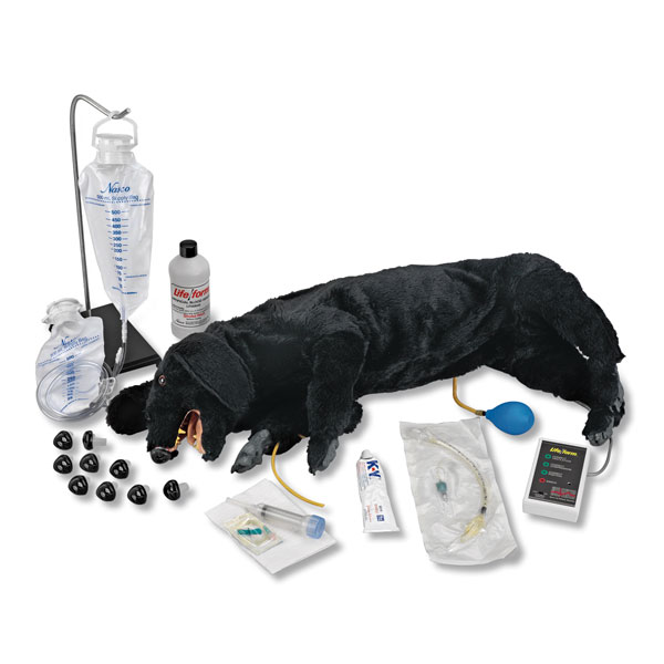 The Advanced Sanitary CPR Dog provides each person with their own sanitary muzzle and nosepiece with a one-way valve. The muzzles may be disinfected and reused, while the nosepieces and lower airways are disposable. Minimizes the chances of cross-contamination and reduces cleanup time. Find training to be much more enjoyable on this sanitary manikin. In addition to practice in assisted breathing, practice the appropriate rate, pressure, and position of cardiac massage; and coordinate the respiratory cardiovascular functions. For more advanced training, an IV can be established as well as placement of an endotracheal tube. The Advanced Sanitary CPR Dog is connected to a small box that shows a green light when the correct ventilation pressure is applied, a blue light indicates correct position for cardiac massage, a white light indicates correct pressures, and an audible beep and a red light indicates excessive pressure. A visible chest rise appears when correct ventilations are applied. Includes soft carrying case, 6 muzzles, 10 nosepieces, and 1 lower disposable airway. Three-year warranty.