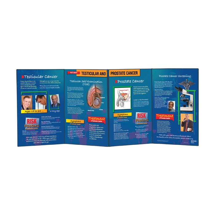Man alive! This folding display speaks men’s language giving them straightforward no-frills facts and encouraging them to have a take-charge approach to protecting their health. It emphasizes the importance of testicular self-examination and prostate screening and identifies the risk factors symptoms and treatment of each condition. 58″ x 22 1/2″ opened.