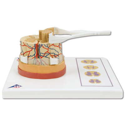 The Spinal cord model illustrates the composition of the spinal cord, magnified to a scale of about 5:1. The spinal cord is formed by a central channel surrounded by “gray matter” with an outer layer of “white matter”. The base of the model features illustrations of the various cross-sections of the spinal cord through the white and gray matter at the neck, torso and lumbar and sacral regions. The Spinal Cord Model with Nerve Endings is supplied on a base.