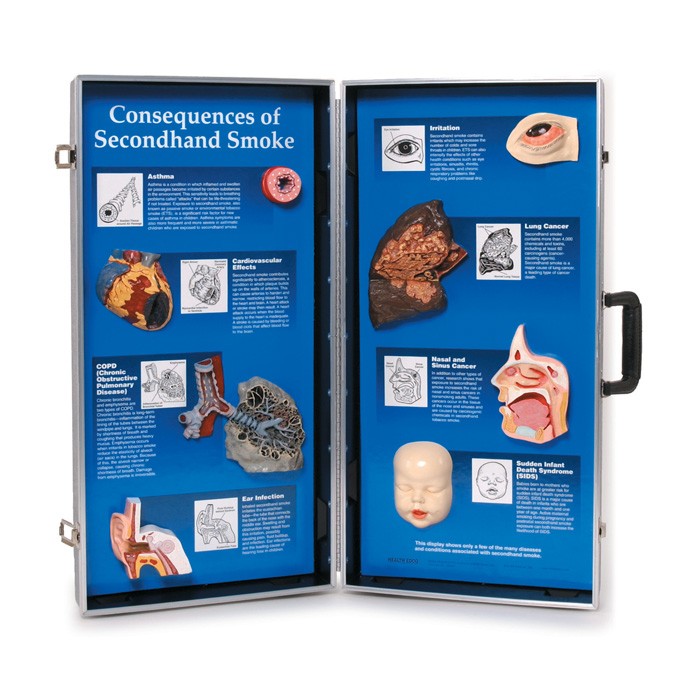 “My parents smoked and all I got was this lousy lung disease!” The eight powerful models on this display quickly snuff out any notion that secondhand smoke is harmless. Lifelike representations of a heart attack, emphysema, and nasal and sinus cancer will have smokers considering the effect their nasty habit is having on the people around them. Comes in a self-contained carrying case. 28″ x 27″ opened.